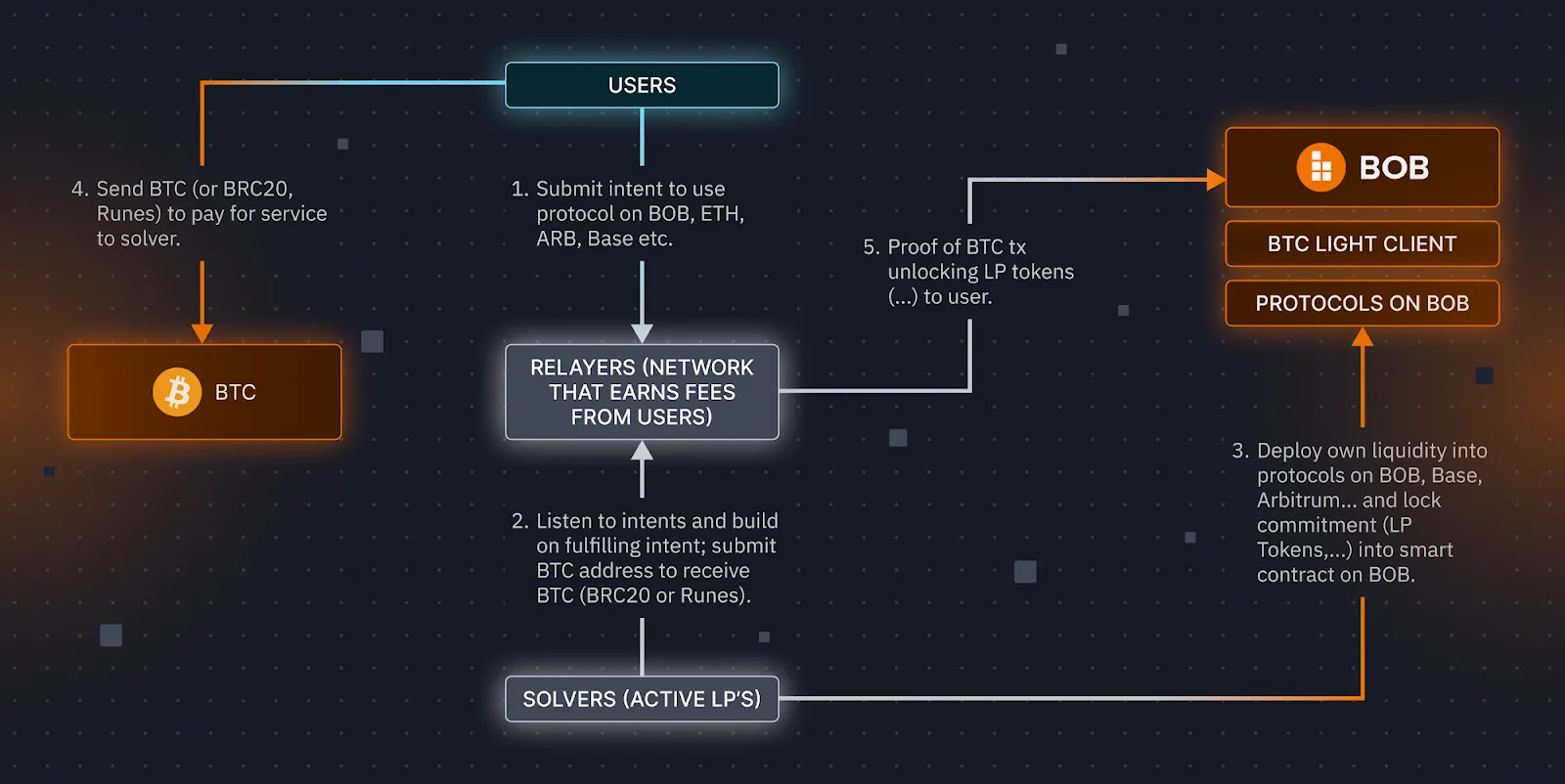 - As Bitcoin confirms the transaction reveal transaction, the relayer network proves their work to BOB's Bitcoin light client, claiming the well-earned reward for the solvers.