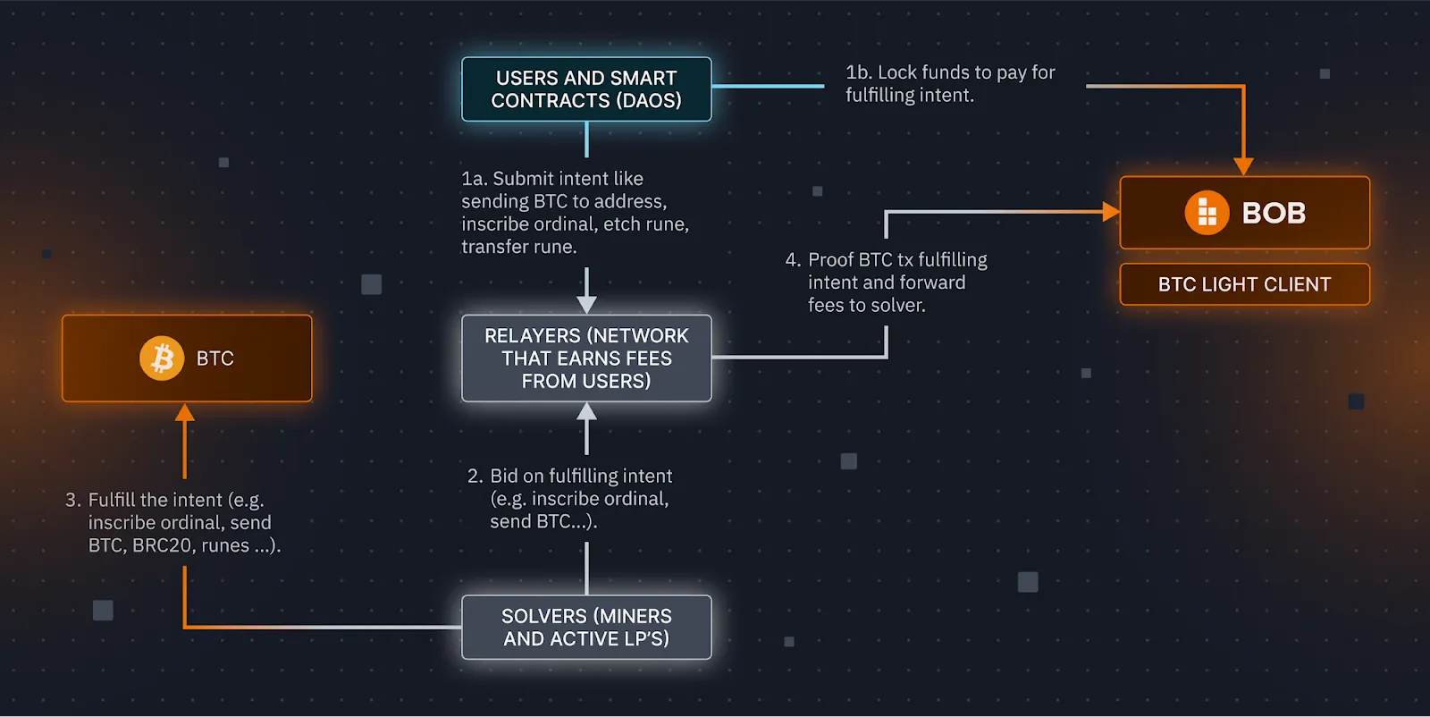 - This intent is broadcast to the network of relayers and solvers. The solvers are competing to inscribe the ordinals in return for the funds locked on BOB.